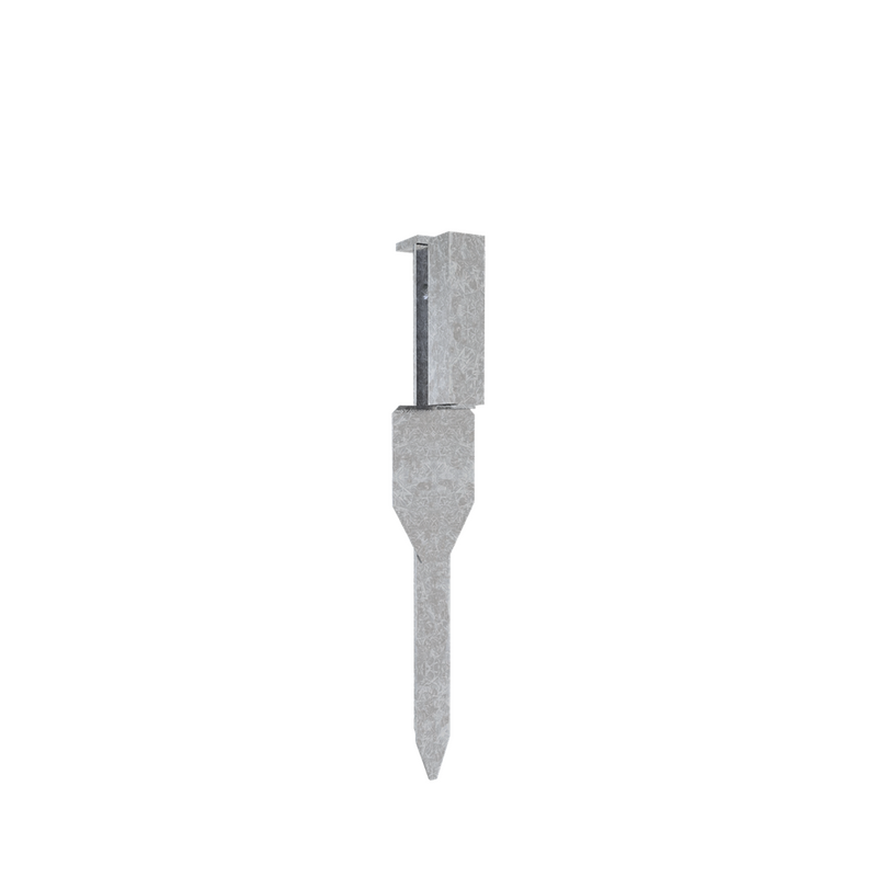 Robuster Erdspieß nach TL, Typ Standard 40, zum Einstecken von 40 x 40 mm und Ø 42 mm Schaftrohren. Das angespitzte T-Profil mit aufgeschweißtem Schlagblech ermöglicht ein einfaches Einschlagen ins Erdreich. Ein Trapezblech sichert den Spieß zusätzlich gegen Torsion. Ideal für Anwendungen im Straßenbau.