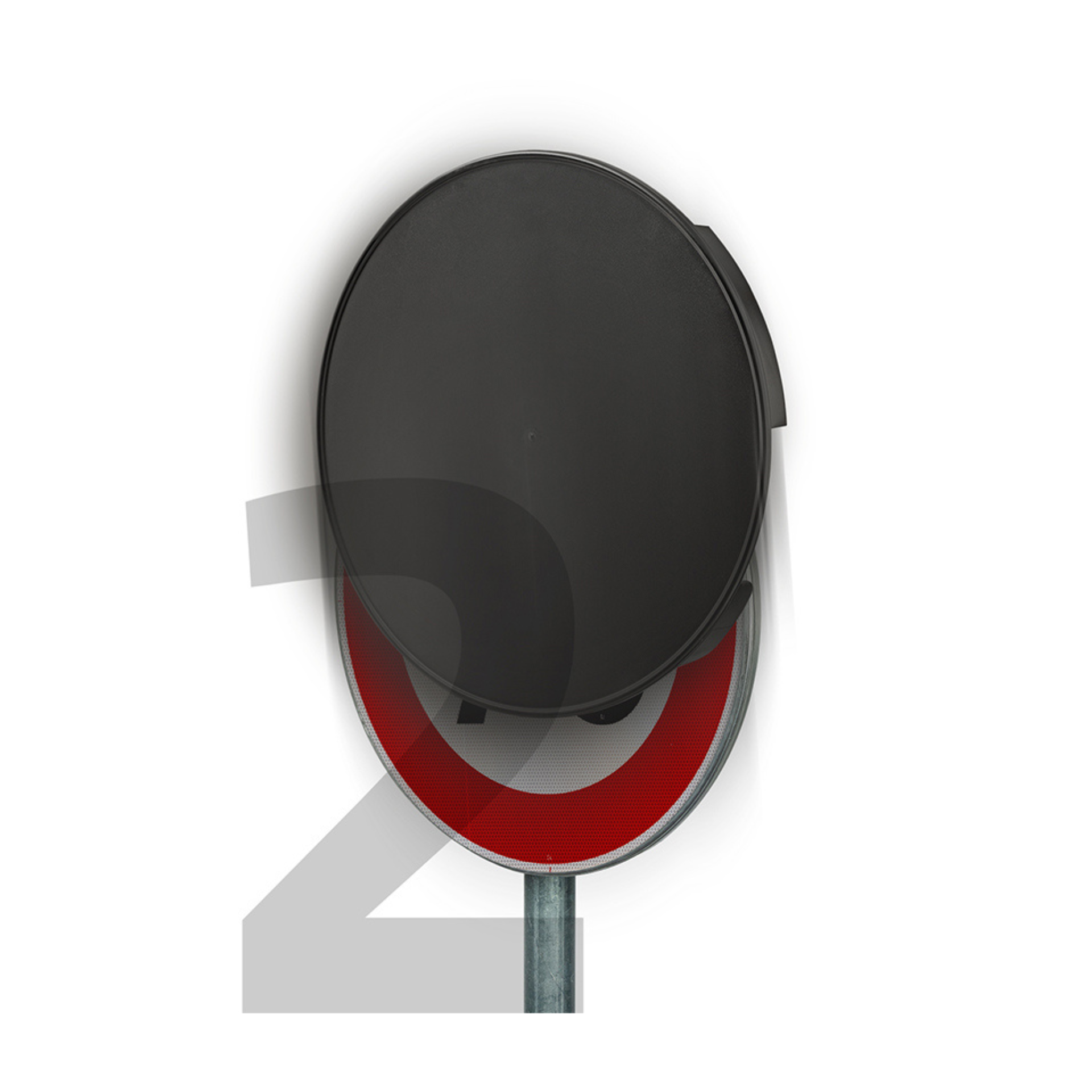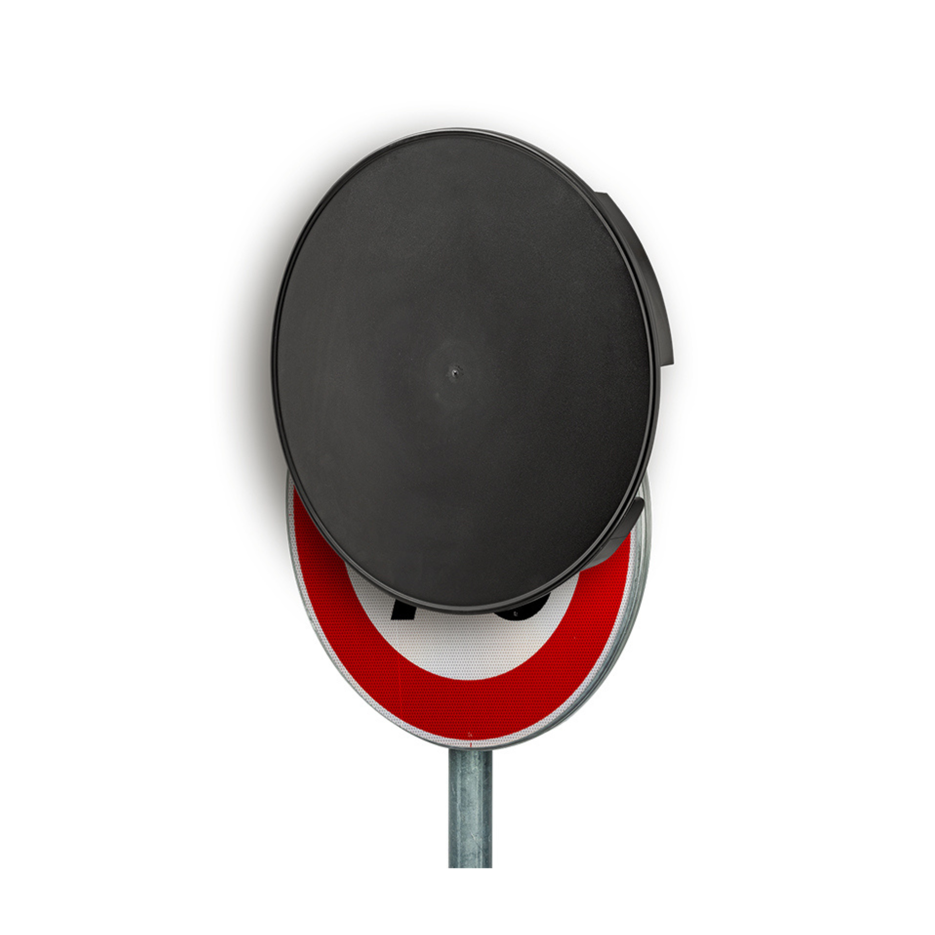 RSA21-konforme Vollabdeckung zur sicheren und berührungsfreien Außerkraftsetzung von Verkehrszeichen der Größe 2. Schnelle Montage ohne Werkzeug, ideal für Flach-, Rund- und Alform-Schilder.