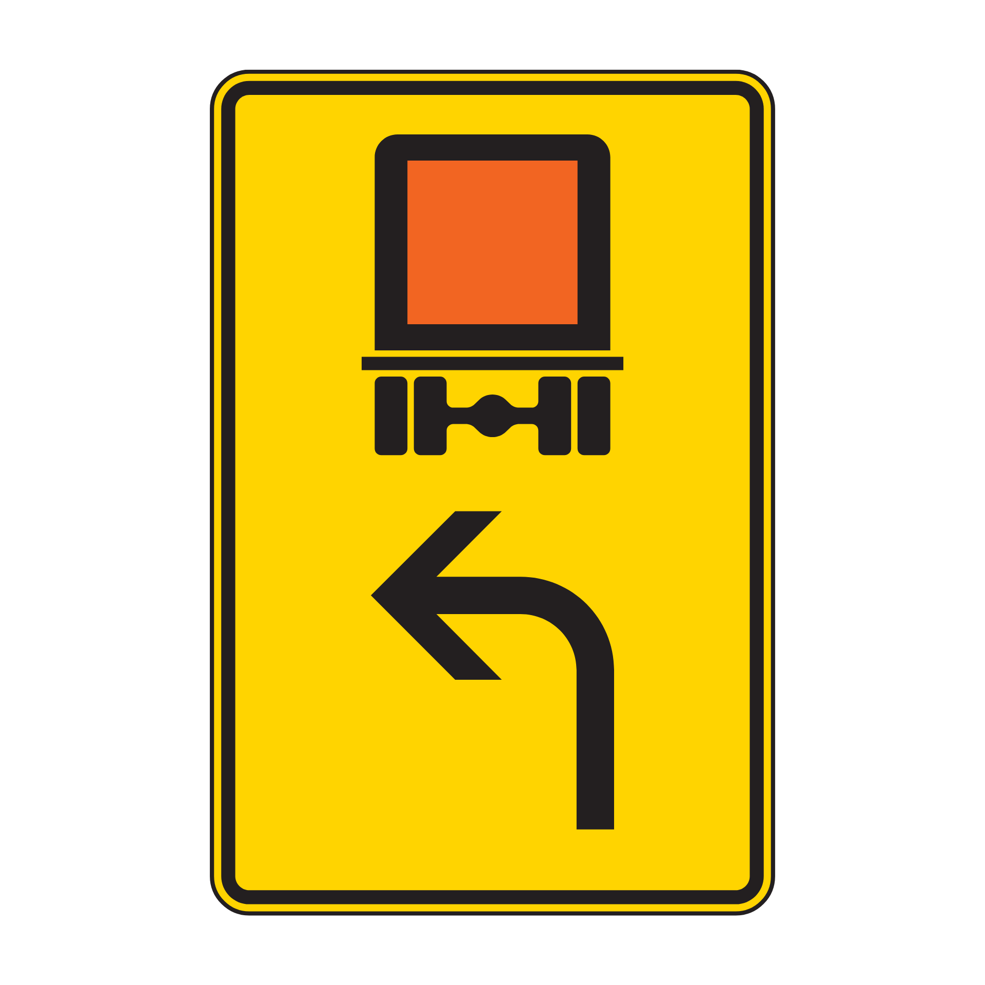 Das Verkehrszeichen 442-11 zeigt kennzeichnungspflichtigen Fahrzeugen mit gefährlichen Gütern im Voraus eine linksweisende Fahrtrichtung an. Es wird zur sicheren und frühzeitigen Lenkung solcher Transporte vor Abzweigungen oder Kreisverkehren eingesetzt.